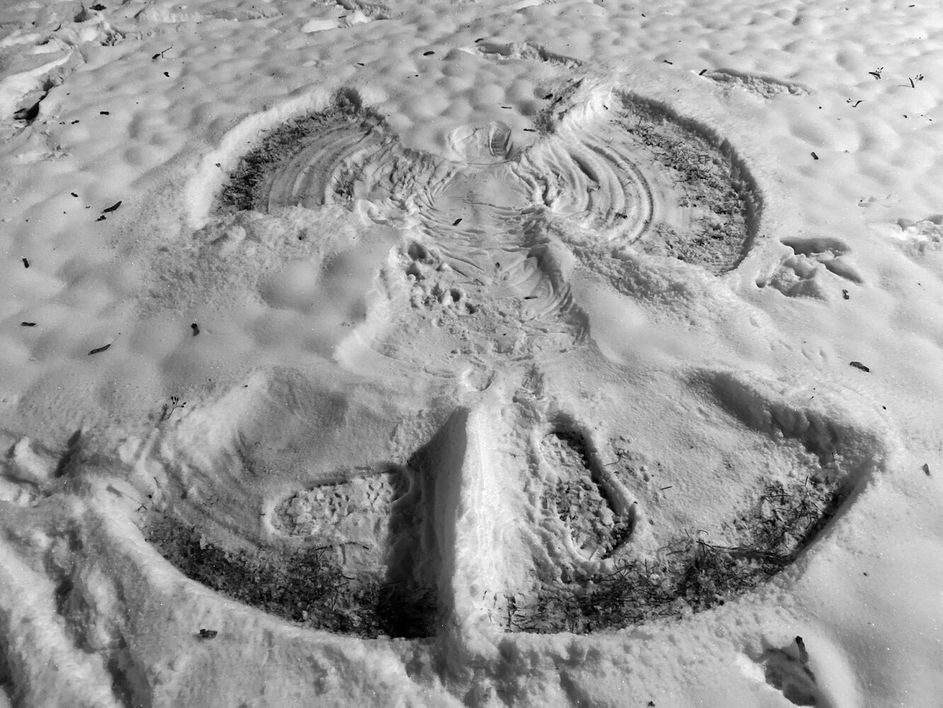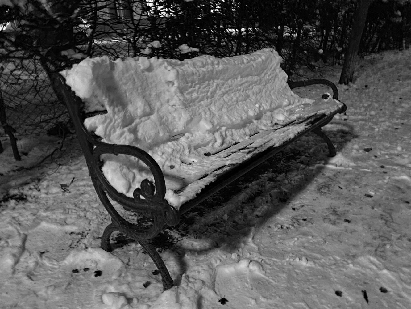”Det är roligare att promenera efter att det snöat för då ser man spåren efter djuren”, sa en vän. På samma vis tycker jag det är roligare att gå i parken efter att det snöat för man ser spåren efter människorna. Här satt en vuxen och hade tid för ett barn. Snöfilten som halkat ner längs parkbänkens ryggstöd tycker jag om, och att göra änglar. Fin är den, tillvaron.