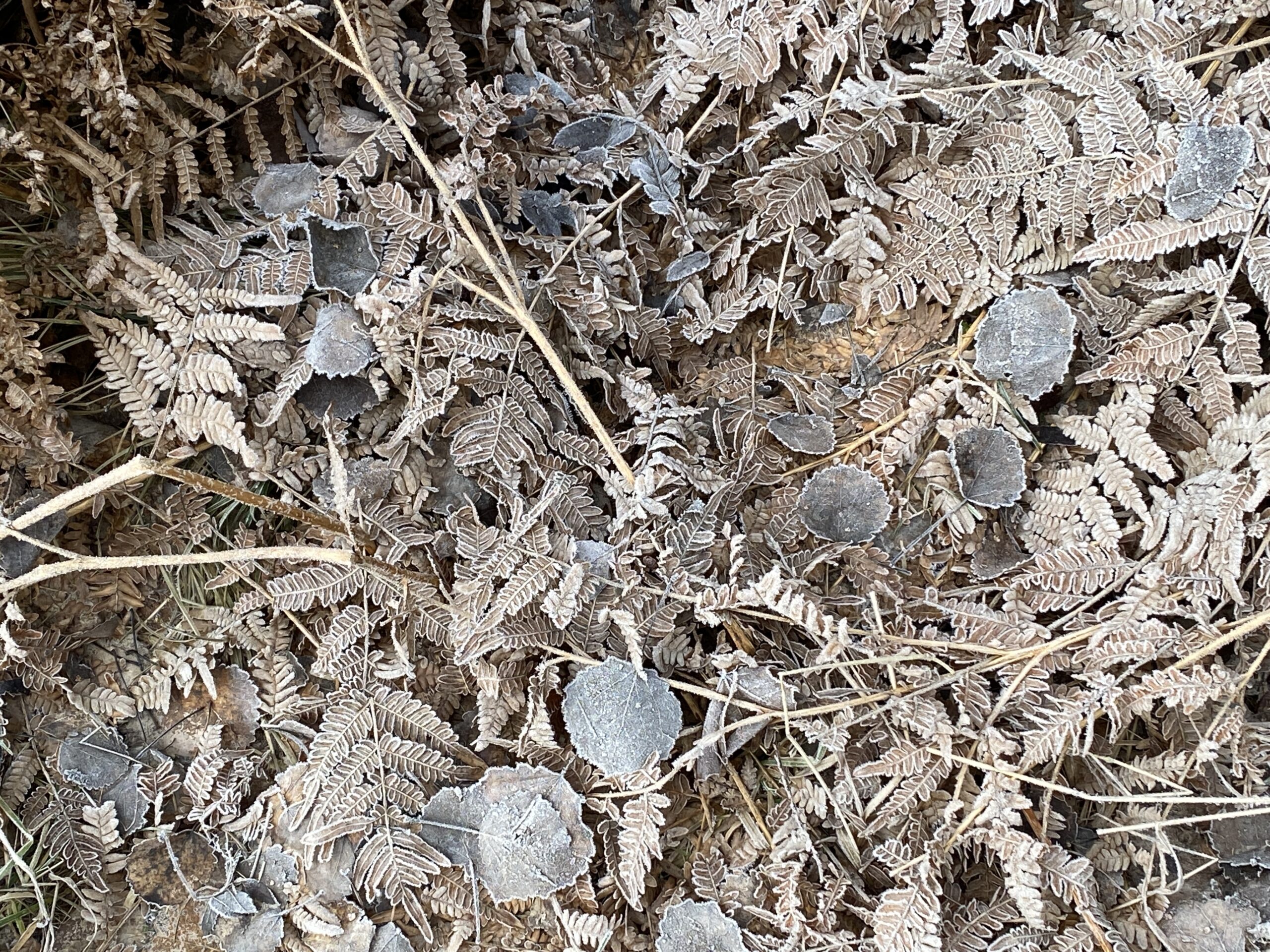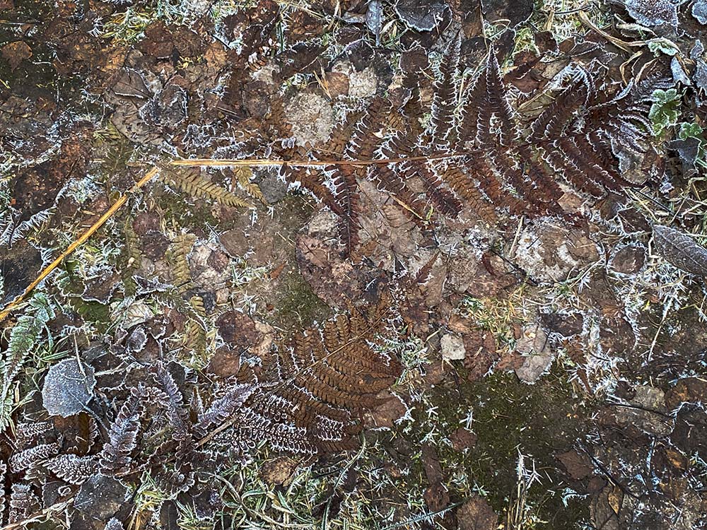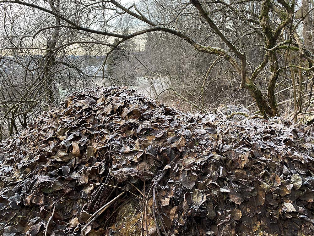 Nu är det vackert bortikring överallt, till och med om en envisas med att gå runt och stirra på sina egna fötter. Naturen går i vintervila och snart är allt vitt, vitt, vitt. Här är mormors lövhög.